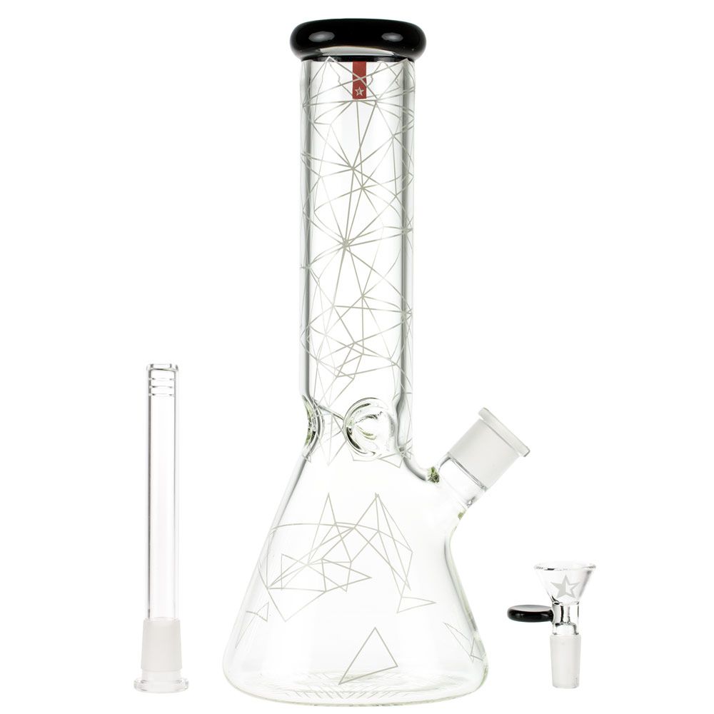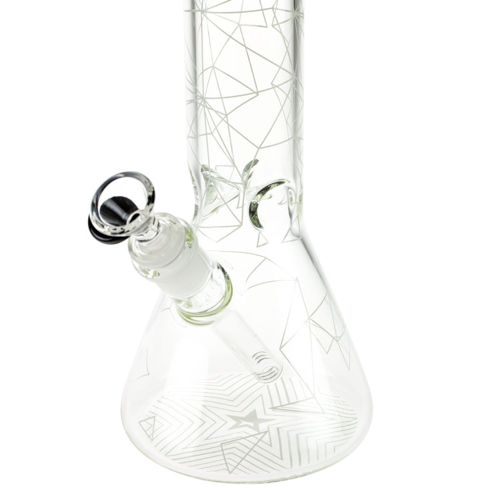 Take off to new heights with the Space Beaker Bong from Famous Brandz. The Famous Designs Space Beaker Bong features a reliable build made from thick borosilicate glass that measures 12” inches tall. Designed with the minimalist in mind, the Space Beaker has a primarily clear body with a white geometric pattern scattered throughout the body and base. A 6-slit diffuser downstem uses small incisions at the bottom of the glass to effectively filter your smoke through water inside the large beaker base as you inhale, and the stem is removable for hassle-free cleaning. Within the neck, a triple-pinched ice catcher allows you to stack up ice cubes inside the tube for more refreshing, frosty cold hits.