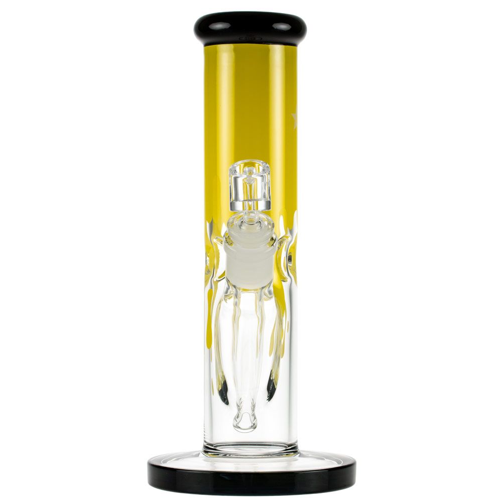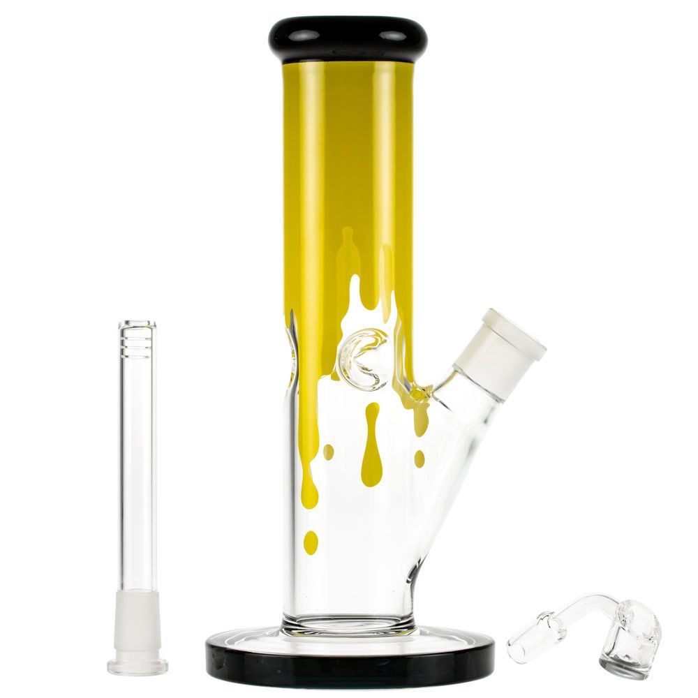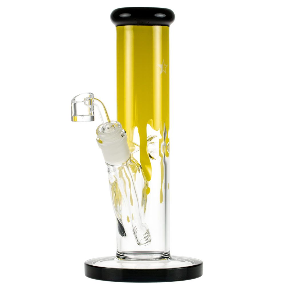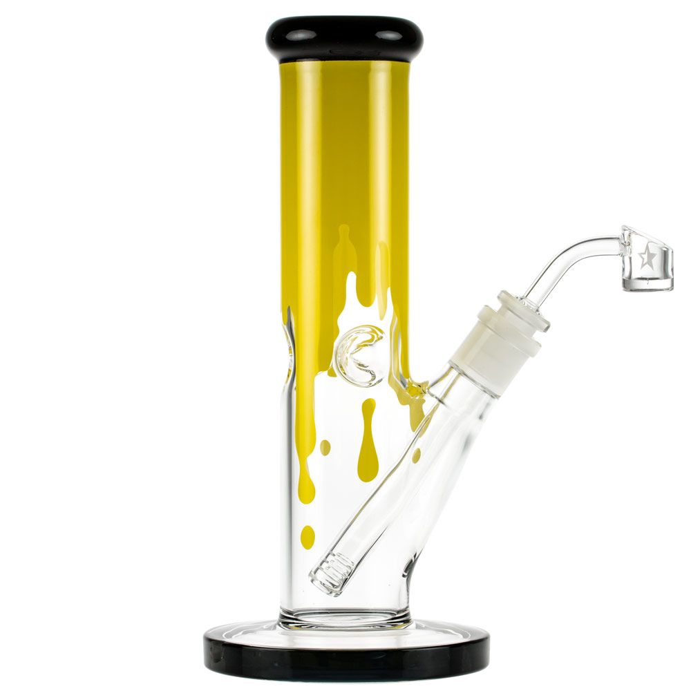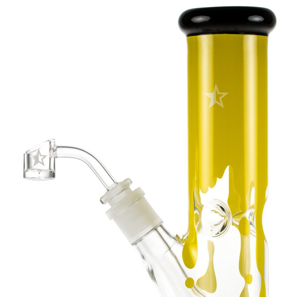 Melt your worries away with the Surrender Straight Tube Rig by Famous Brandz. This sweet glass oil rig is decked out with a honey-colored 3D drip pattern highlighted by a gold Famous Brandz Star decal at the top. Matching black accents on the rounded mouthpiece and thick glass flared base give this oil rig even more of a stunning aesthetic while working to keep your water pipe stable between uses. At the base of the straight tube, the Surrender Rig boasts a 6-slit diffuser downstem that filters your vapor through water for smoother dabs. The downstem is removable to allow for hassle-free cleaning and holds a high-grade quartz banger nail designed for tasty, low-temp dabs from your favorite wax concentrates.